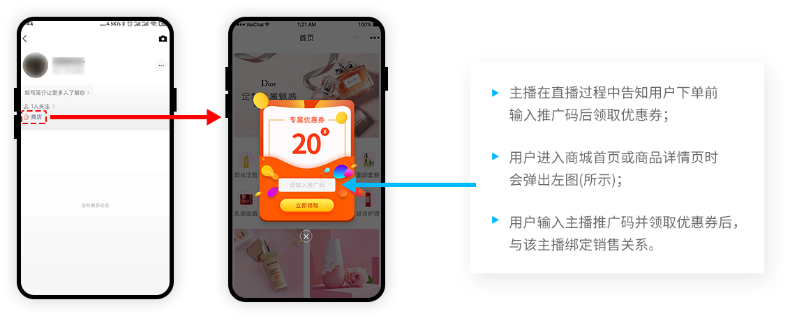首创【主播推广码】功能,让主播与粉丝可以轻松建立销售关系,并结合【云平台】丰富的奖励机制,实现分销带货。